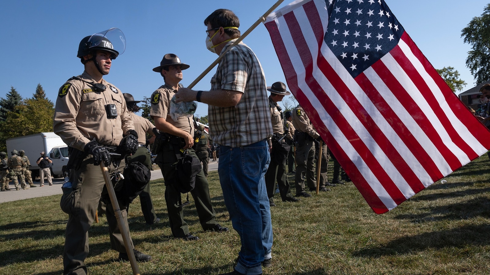 Federal law enforcement agents stand guard as they are confronted by community members and activists for reportedly shooting a woman in the Brighton Park neighborhood on October 4, 2025 in Broadview, Illinois.